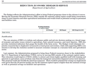 Framed as “savings and reform,” the proposal is to move the USDA’s Economic Research Service out of Washington DC. Although this proposal says the purpose is to bring the ERS closer to rural America, its real purpose is to put the ERS out of business.